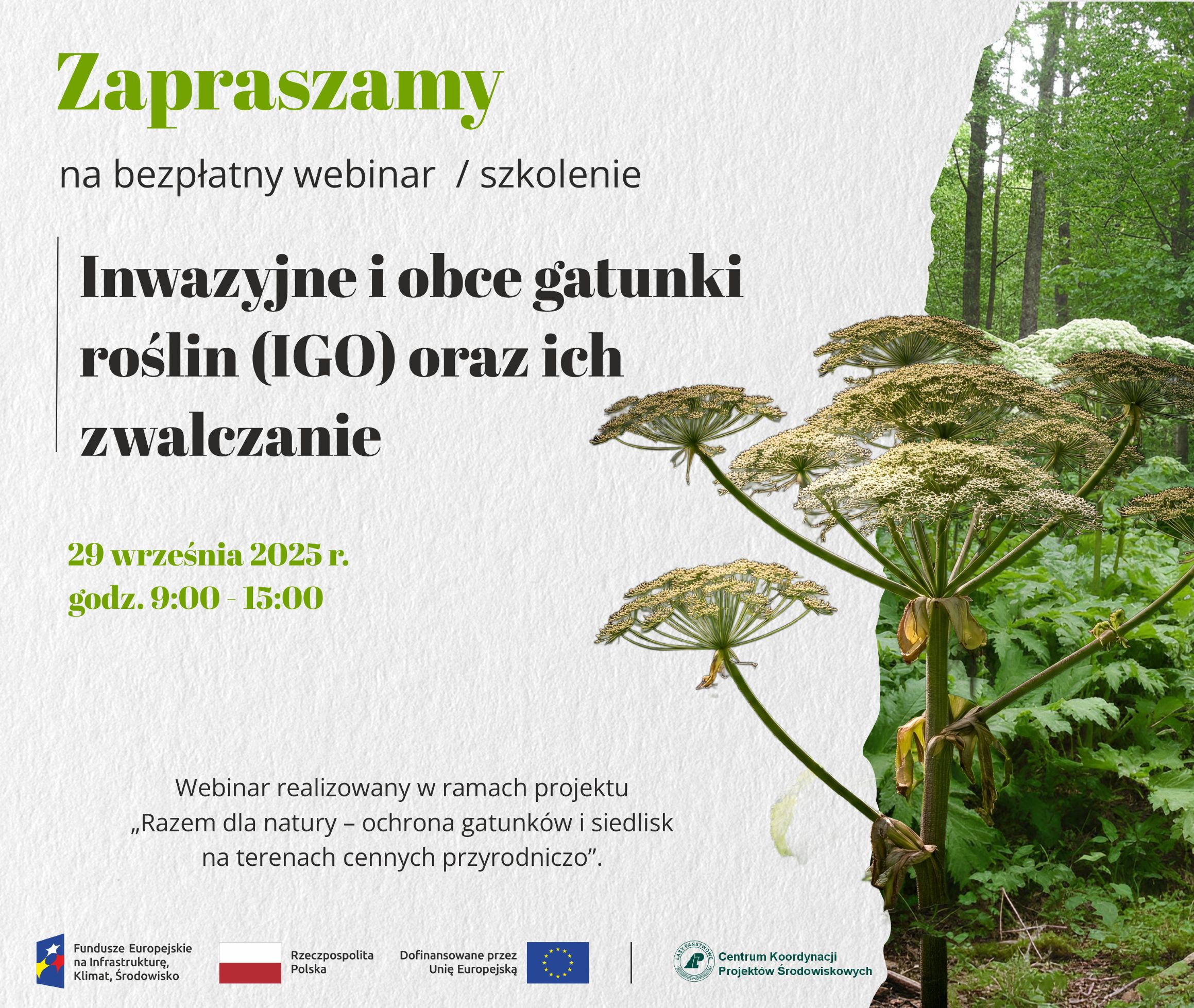 Serdecznie zapraszamy wszystkich zainteresowanych do udziału w webinarze szkoleniowym nt. inwazyjnych gatunków obcych (IGO) roślin oraz metod ich zwalczania, ze szczególnym uwzględnieniem znaczenia IGO, ich wpływu na usługi ekosystemowe, metod działań zaradczych wobec IGO, charakterystyki i rozpoznawania wybranych IGO roślin oraz obowiązków wynikających z ustawy o gatunkach obcych.